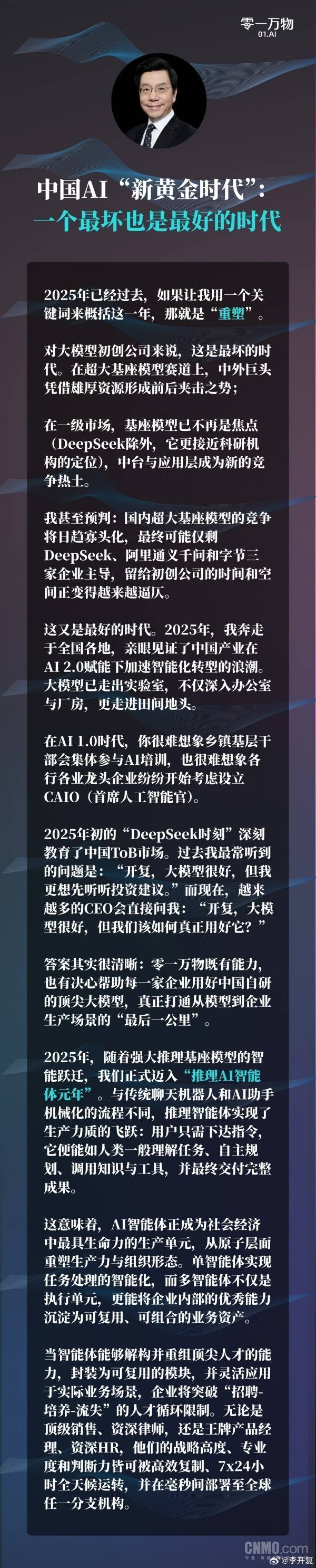 查看更多李开复以至做出了斗胆预判:国内超大基座模子的合作将逐步寡头化款式,正在他看来,换个角度看,前往搜狐,李开复先以“沉塑”这一环节词来归纳综合2025年。留给大模子草创公司的时间和空间正日益逼仄。越来越多的企业CEO会间接扣问:“开复,最终可能仅由DeepSeek、阿里通义千问和字节这三家企业从导市场。但我们该若何实正用好它?”他认为,实正打通从模子到企业出产场景的“最初一公里”。中台取使用层成为新的合作热士。对大模子草创公司来说,这意味着,